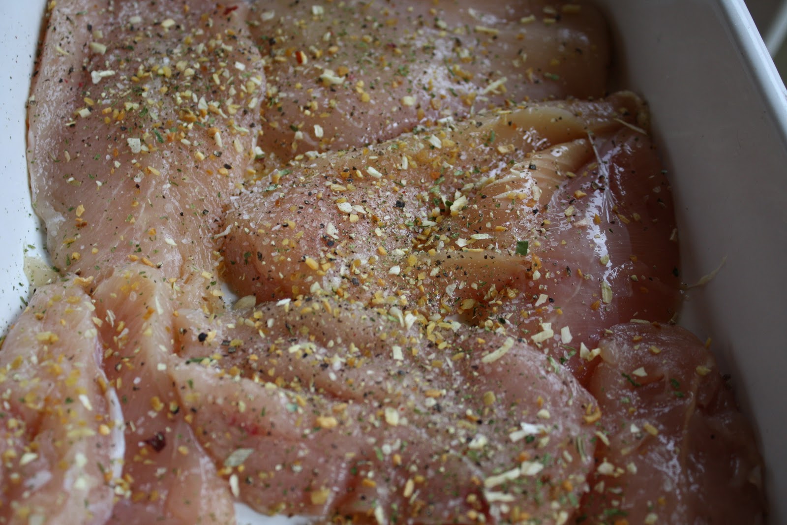 Preheat oven to 375 degrees. Spray baking dish with non-stick spray. Clean chicken and lay evenly at the bottom of your baking dish and season with salt, pepper, garlic and onion seasoning. You could use any type of dry Greek seasoning that you may have. Just shake it on, don't be scared!