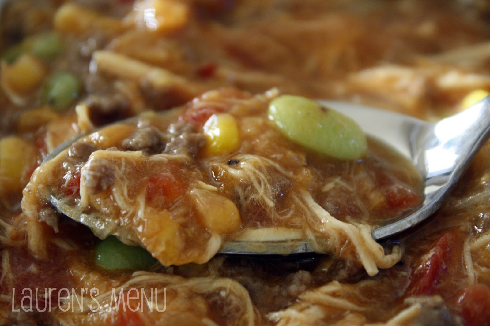 Place onion in a large slow cooker, place chicken over onion. Add all other ingredients, EXCEPT the browned ground beef. Cook covered at HIGH 6 hours. Remove chicken and shred, return to stew. If desired, cook and brown 1 pound ground beef, add to stew. It is even better the next day!